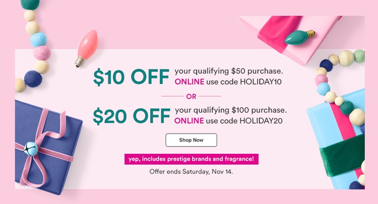 There’s a new Ulta prestigious coupon that gets you $10 off $50 with code HOLUDAY10 r $20 off $100 using code HOLIDAY20 at ulta.com. This is valid for the next three days and ends November 14th. The coupon is one time use only.